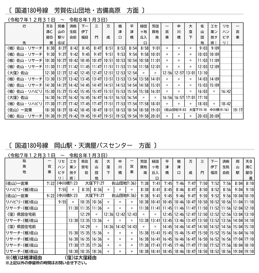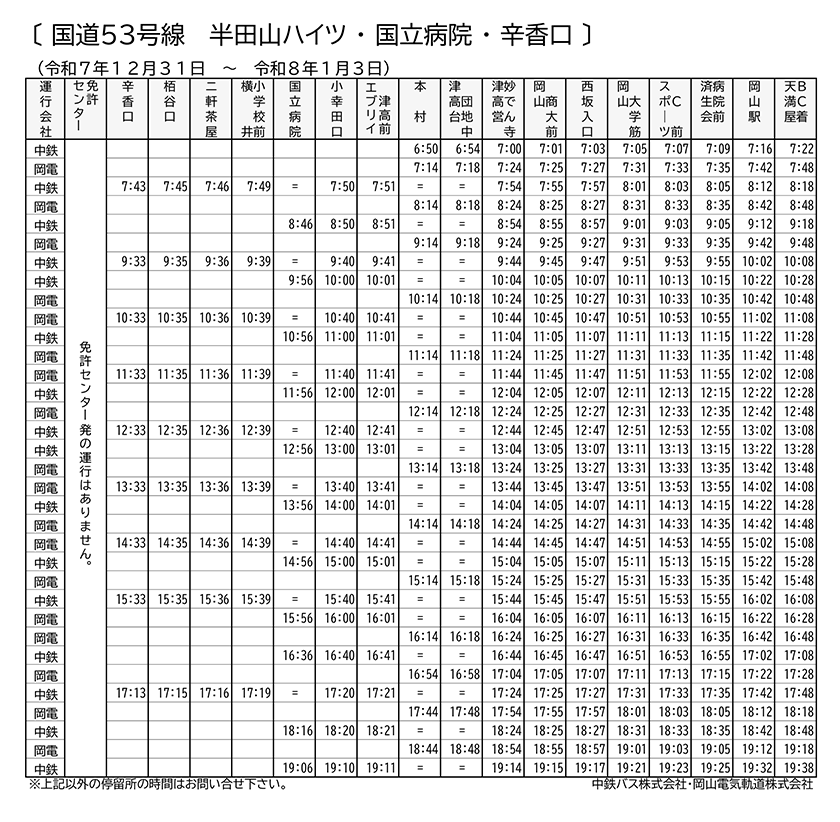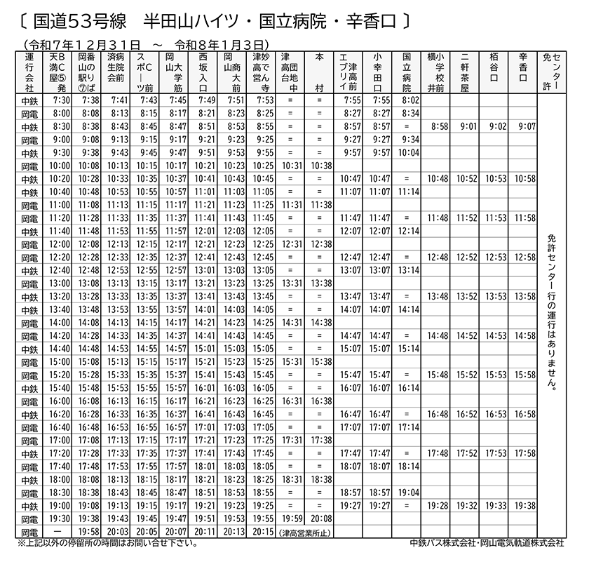 尚、12/31(水)は特別ダイヤの為、「免許センター」でのお乗り換えができません。「国立病院」でのお乗り換えをお願いします。
