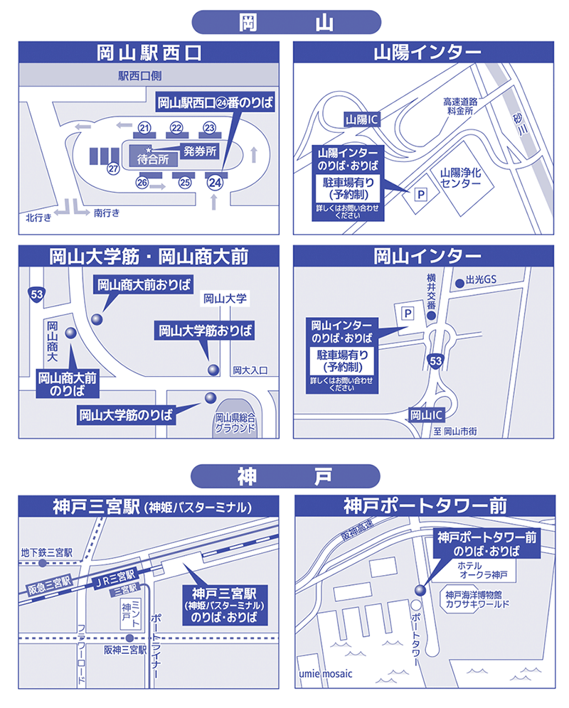 岡山商大前・岡山インター・ 岡山大学筋・岡山駅西口 |